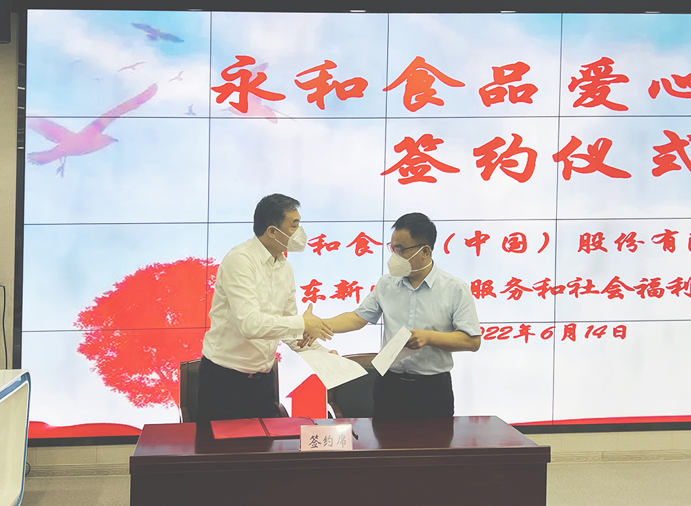 永和食品公司董事長林建雄(左)和養(yǎng)老服務(wù)和社會(huì)福利事務(wù)中心副主任于明(右)簽署捐贈(zèng)協(xié)議