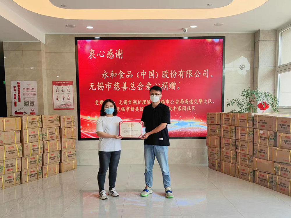 無錫市慈善總會向永和食品公司頒發(fā)了捐贈證書,感謝其對于疫情防控工作的大力支持。這項證書的授予,也是慈善總會對永和豆?jié){積極投身公益慈善事業(yè),履行社會責(zé)任的高度肯定。