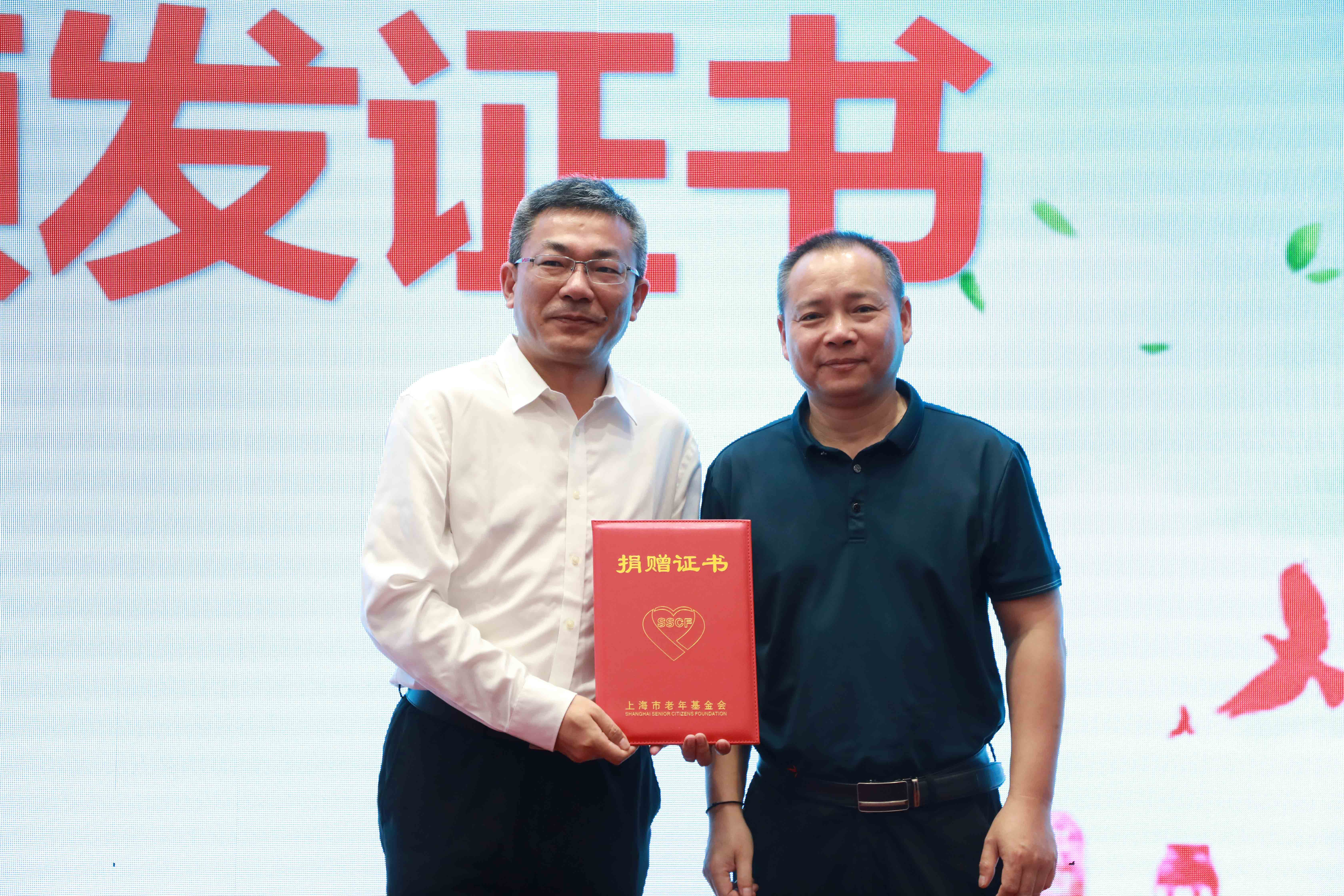 靜安區(qū)民政局沈連心副局長(zhǎng)(右)頒發(fā)捐贈(zèng)證書(shū)