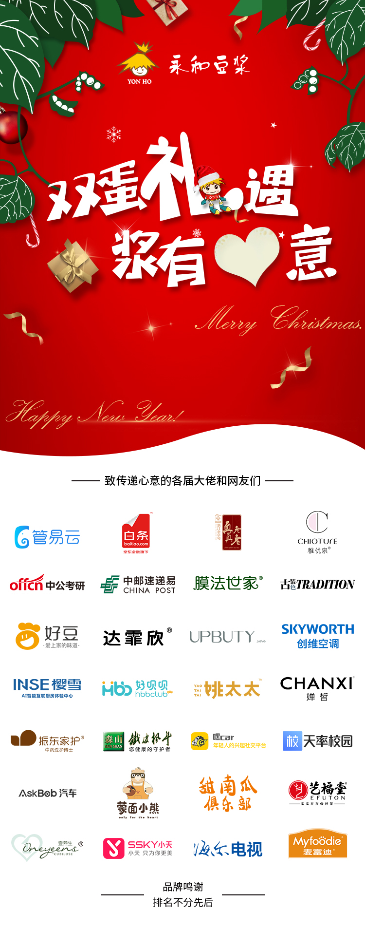 美麗的事物俯仰皆是,有趣的靈魂直擊心靈!12月25日,永和豆?jié){發(fā)起#雙蛋禮遇,漿有心意#微博話題互動(dòng),共聯(lián)合28家藍(lán)V在圣誕和元旦雙節(jié)期間為廣大消費(fèi)者準(zhǔn)備了繽紛多彩的禮物@創(chuàng)維空調(diào) @古裝古色 @天率校園 @藝福堂 @管易云 @膜法世家 @UPBUTY @稚優(yōu)泉化妝品 @嘿car @甜南瓜俱樂部 @海爾電視 @CHANXI嬋皙 @速遞易 @達(dá)霏欣_米諾地爾 @好唄唄育兒官方微博 @森山鐵皮楓斗 @蒙面小熊的甜蜜王國 @小天創(chuàng)意科技 @姚太太食品 @麥富迪官方微博 @四川中公考研培訓(xùn) @好豆網(wǎng) @櫻雪集團(tuán) @振東生物 @壹燕生OneYeens @京東白條官方微博 @真真老老官方微博 @AskBob資訊汽車頻道 這些藍(lán)V的參與也讓永和豆?jié){的雙蛋彩禮更添色彩!