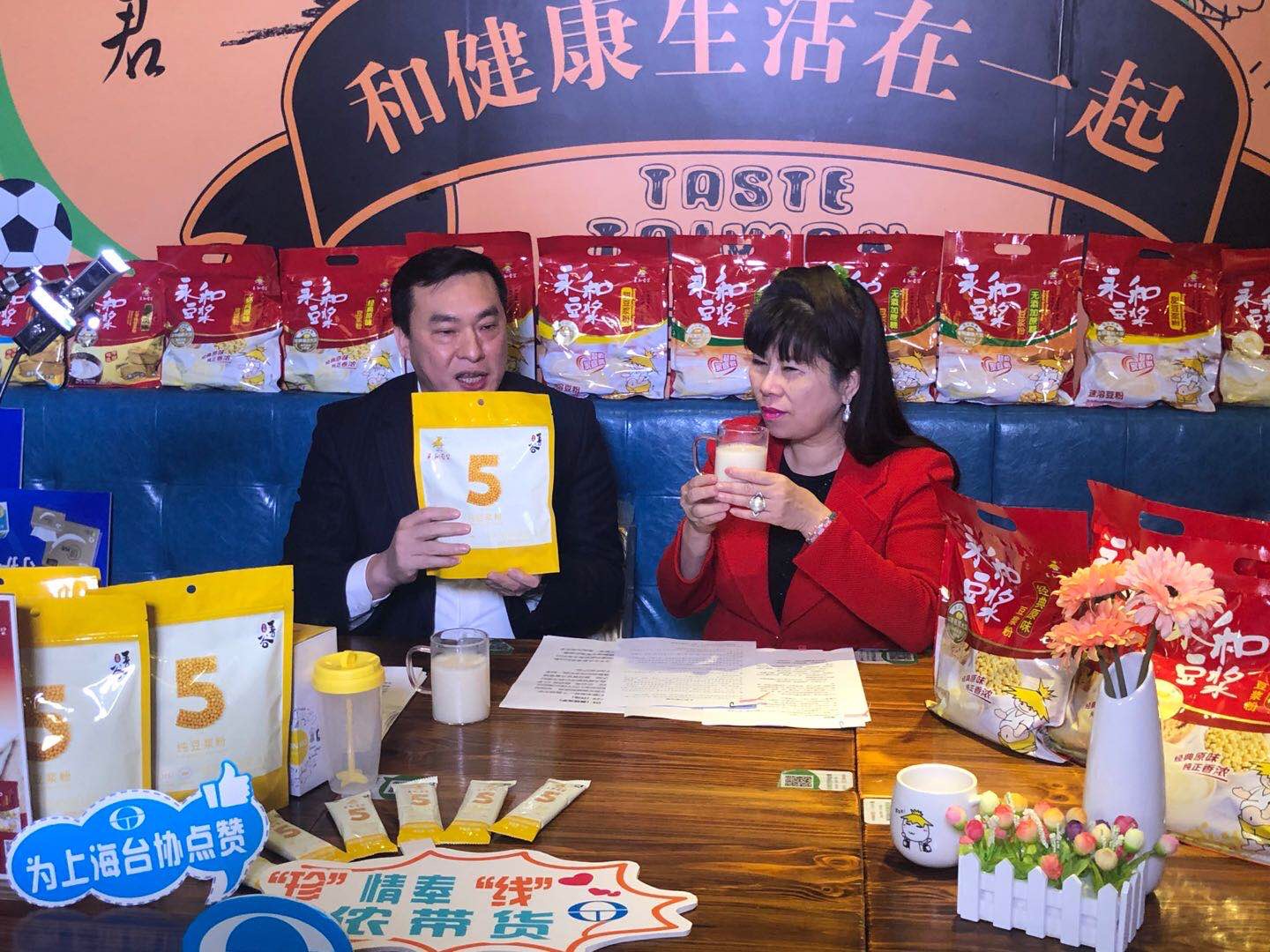 本次直播選址上海浦東南泉北路400號(hào)的永和豆?jié){世紀(jì)店,永和豆?jié){林建雄董事長(zhǎng)親臨門(mén)店直播現(xiàn)場(chǎng),和臺(tái)協(xié)張簡(jiǎn)珍會(huì)長(zhǎng)一起化身直播達(dá)人,為大家?guī)?lái)了直播購(gòu)物福利,同時(shí)通過(guò)永和豆?jié){旗下的兩款熱銷(xiāo)產(chǎn)品:510g經(jīng)典原味豆?jié){粉、180g吾谷純豆?jié){粉向觀眾展示了永和豆?jié){專(zhuān)注豆?jié){領(lǐng)域38年的企業(yè)實(shí)力。