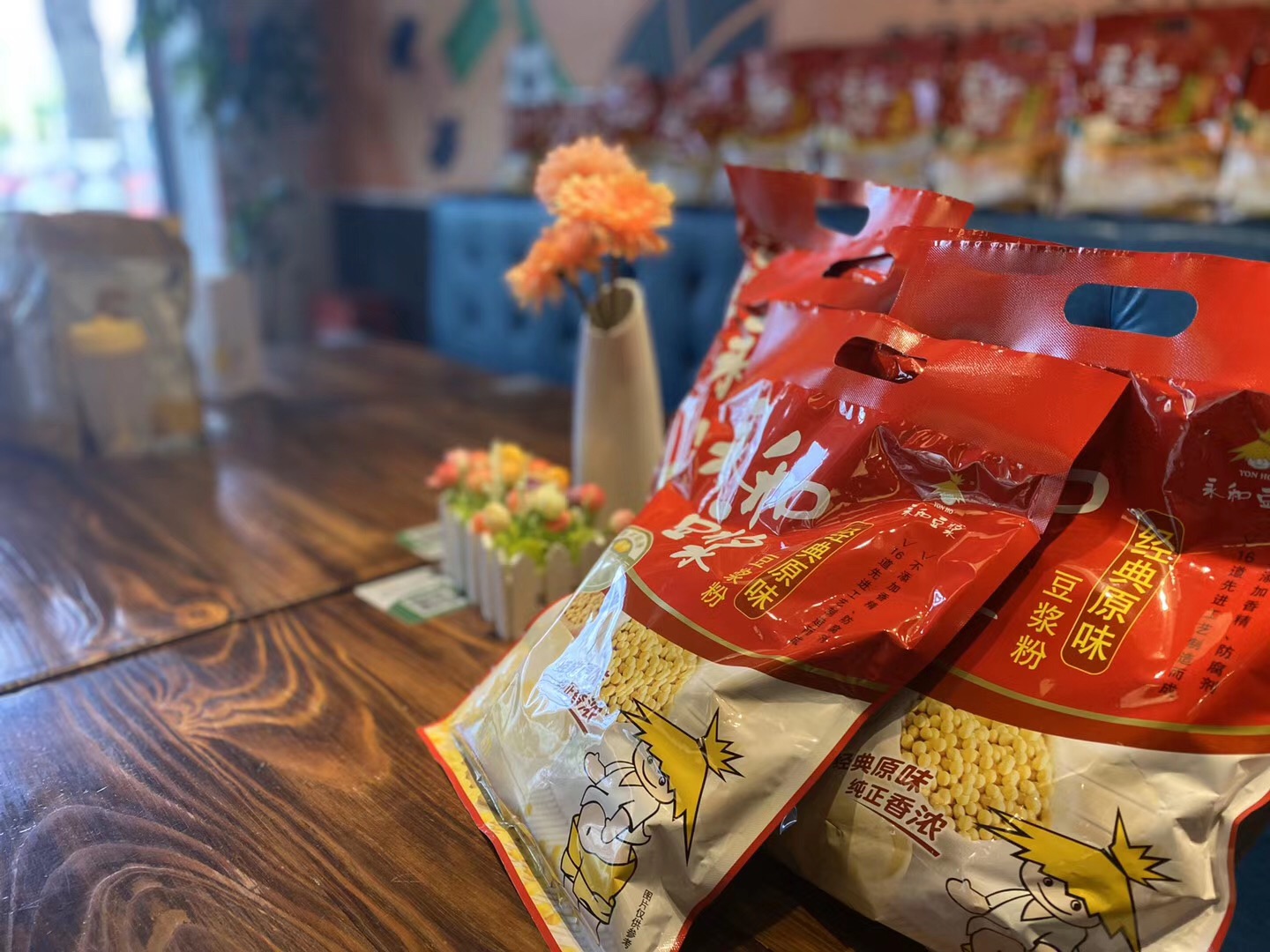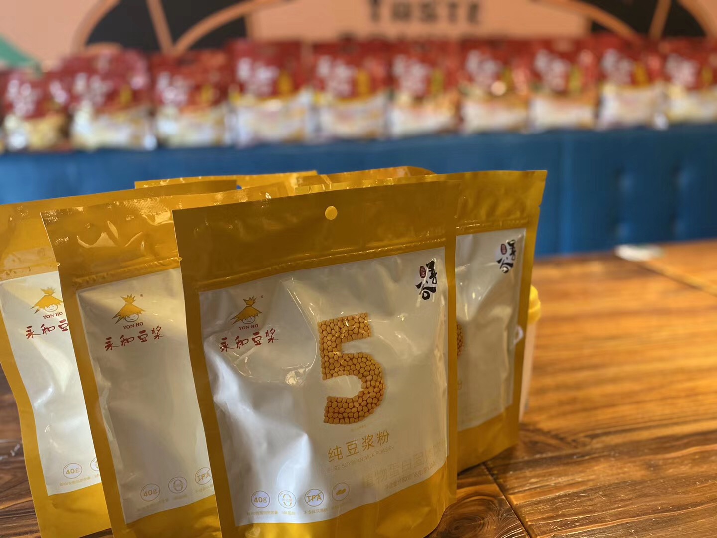 510g經(jīng)典原味豆?jié){粉,采用非轉(zhuǎn)基因大豆作為原料,獨(dú)立小包設(shè)計(jì),沖泡便捷?,F(xiàn)場(chǎng)工作人員只花1分鐘便沖泡出了一杯暖暖的永和豆?jié){。臺(tái)協(xié)會(huì)長(zhǎng)張簡(jiǎn)珍品嘗過(guò)后,直夸喝起來(lái)味道純正,香濃順滑,口感細(xì)膩,微甜的味道恰到好處。