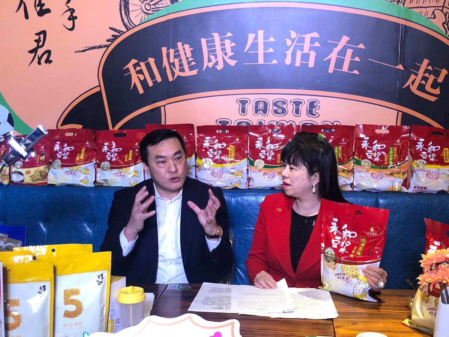 4月27日下午,上海市臺(tái)協(xié)會(huì)長(zhǎng)張簡(jiǎn)珍女士親臨永和豆?jié){世紀(jì)店,與永和豆?jié){董事長(zhǎng)林建雄先生在抖音短視頻APP上開(kāi)展了一場(chǎng)線上直播,為大眾展示永和豆?jié){的產(chǎn)品,讓大家通過(guò)新的傳播形式了解永和豆?jié){。