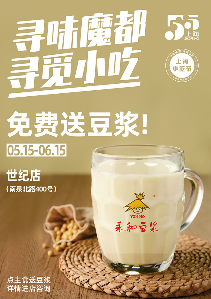 為實(shí)實(shí)在在惠及市民,本次小吃節(jié),永和豆?jié){在餐飲門店也推出了買主食免費(fèi)贈豆?jié){活動!5.15-6.15活動期間前往永和豆?jié){世紀(jì)店(浦東新區(qū)南泉北路400號)購買主食即可免費(fèi)獲贈一杯香濃美味的豆?jié){!