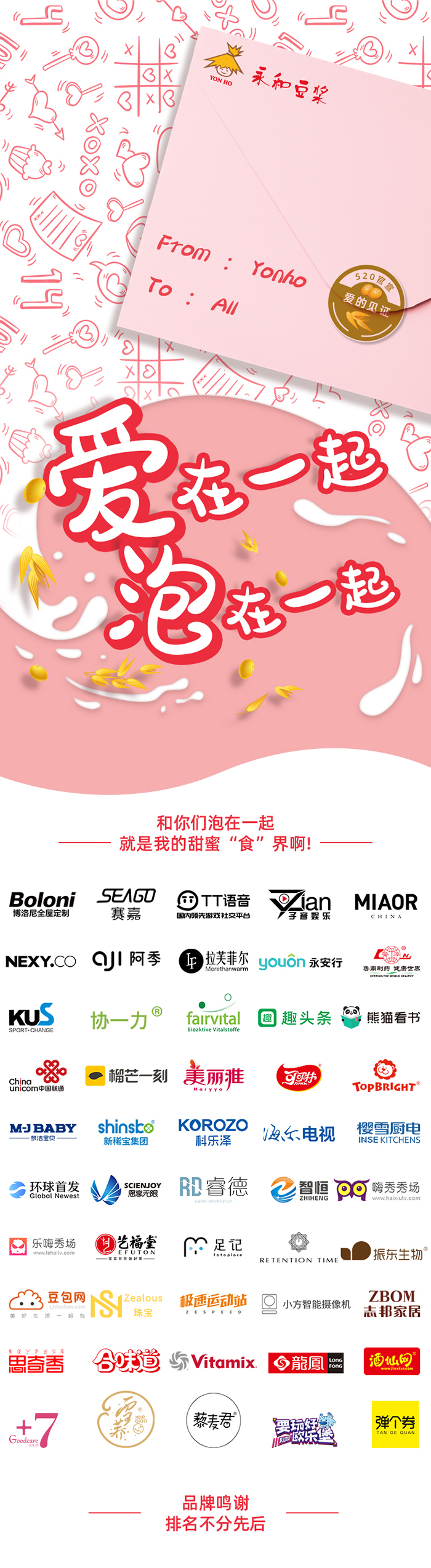 令人激動(dòng)的520表白日在眾多有情人的甜蜜時(shí)光中慢慢走過(guò)。一波又一波的隔空甜蜜撒糖秀,各種或高調(diào)或含蓄的官宣,每到520,各式秀恩愛(ài)操作總是層出不窮。這不,永和豆?jié){小姐和永和燕麥先生這對(duì)搭檔也組成甜蜜CP,于5.19至5.26期間,在50家藍(lán)V品牌的見(jiàn)證下發(fā)出愛(ài)的宣言:愛(ài)在一起,泡在一起。喜歡不只是說(shuō)愛(ài),泡在一起更甜蜜!