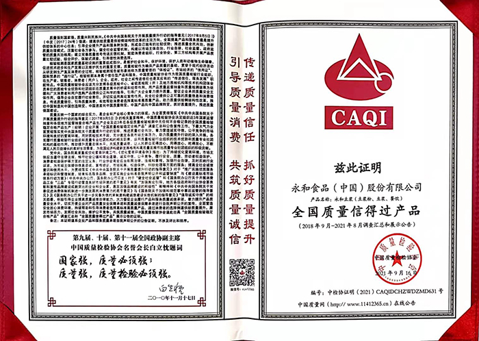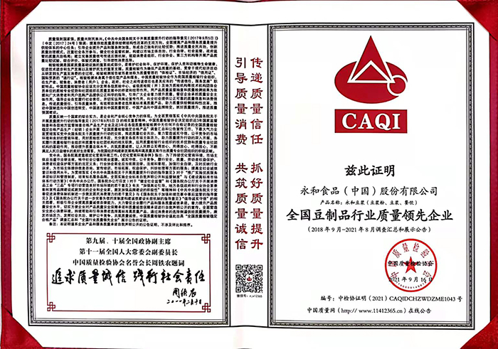 2021年9月,永和食品(中國)股份有限公司再次榮獲中國質(zhì)量檢驗(yàn)協(xié)會(huì)頒發(fā)的“全國豆制品行業(yè)質(zhì)量領(lǐng)先企業(yè)”、“全國食品行業(yè)質(zhì)量領(lǐng)先品牌”、“全國質(zhì)量信得過產(chǎn)品”、“全國質(zhì)量檢驗(yàn)穩(wěn)定合格產(chǎn)品”榮譽(yù)稱號(hào),又一次向社會(huì)各界證實(shí)了永和豆?jié){始終如一的品質(zhì)堅(jiān)持!