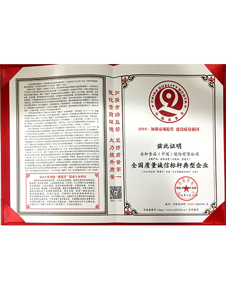 20189 月永和食品(中國)股份有限公司榮獲2018全國質(zhì)量誠信標(biāo)桿典型企業(yè) -