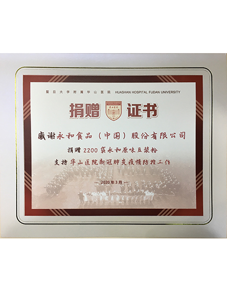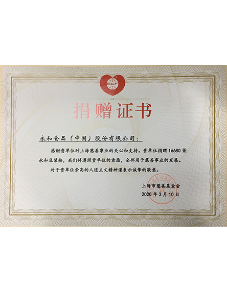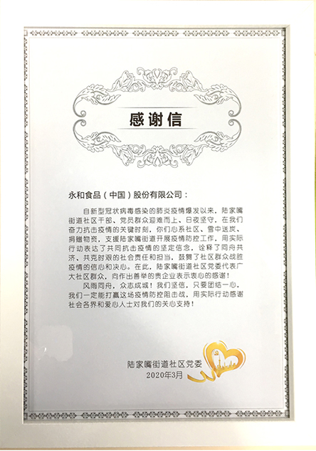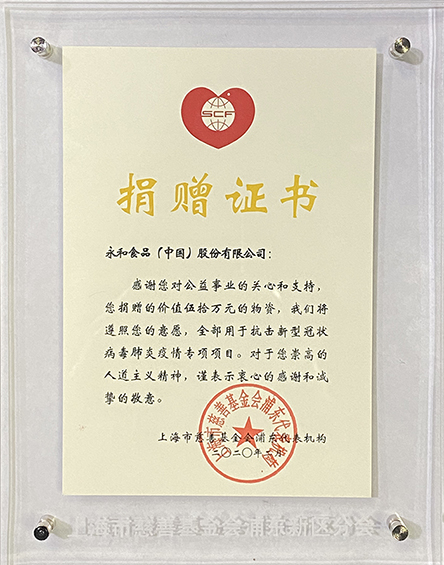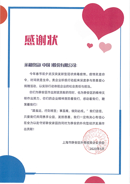 20205 月自2020疫情爆發(fā)以來,永和食品(中國)股份有限公司積極承擔(dān)企業(yè)責(zé)任,深度參與靜安區(qū)慈善愛心捐贈活動,將愛心傳遞,為健康續(xù)航!上海市靜安區(qū)外商投資企業(yè)協(xié)會為此頒發(fā)感謝狀! -