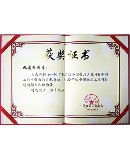 20197 月為表彰林建雄2016-2017年度在全國食品工業(yè)科技創(chuàng)新工作中做出的貢獻(xiàn),中國食品工業(yè)協(xié)會授予林建雄榮譽(yù)稱號和證書 -