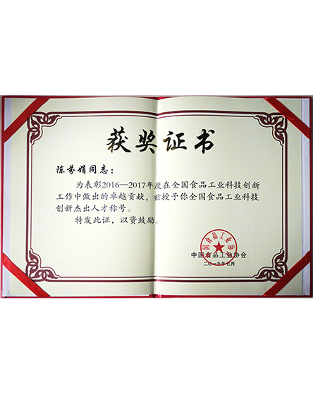 20197 月為表彰陳芬娟2016-2017年度在全國食品工業(yè)科技創(chuàng)新工作中做出的貢獻(xiàn),中國食品工業(yè)協(xié)會授予陳芬娟榮譽(yù)稱號和證書 -