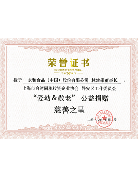 20181 月上海市臺灣同胞投資企業(yè)協(xié)會靜安區(qū)工作委員會授予永和食品(中國)股份有限公司林建雄董事長愛幼&敬老”公益捐贈慈善之星榮譽(yù)證書 -