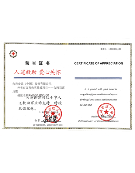 20182 月為感謝永和食品(中國)股份有限公司對紅十字人道救助事業(yè)的支持,上海市紅十字會授予“人道救助 愛心關(guān)懷”榮譽(yù)證書 -