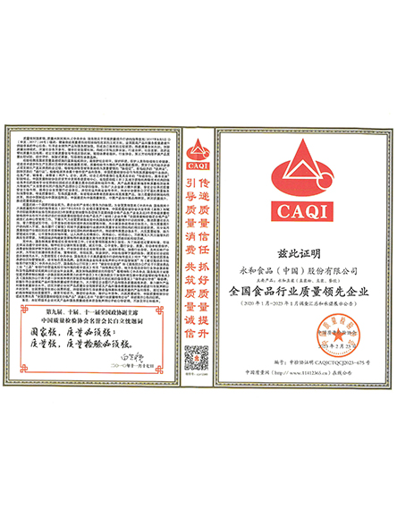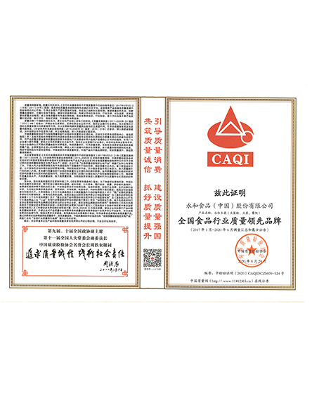 20232 月永和食品(中國)股份有限公司榮獲全國食品行業(yè)質(zhì)量領(lǐng)先企業(yè) -
