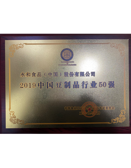 20194 月永和食品(中國)股份有限公司榮獲2019中國豆制品行業(yè)50強(qiáng) -