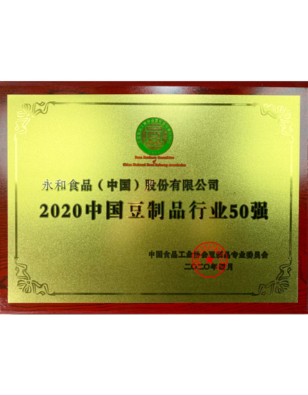 20204 月永和食品(中國)股份有限公司榮獲2020中國豆制品行業(yè)50強(qiáng) -