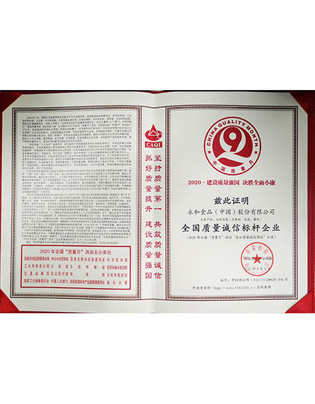 20209 月永和食品(中國)股份有限公司榮獲全國質(zhì)量誠信標(biāo)桿企業(yè)稱號 -