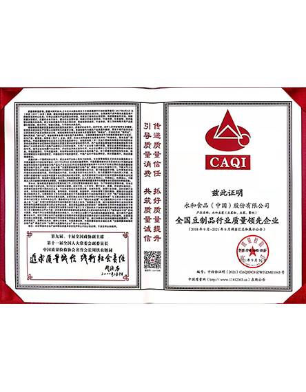 20219 月永和食品(中國)股份有限公司榮獲全國豆制品行業(yè)質(zhì)量領(lǐng)先企業(yè) -