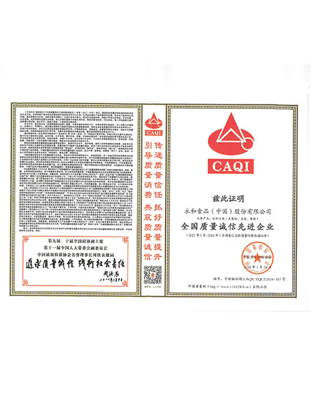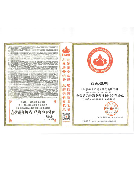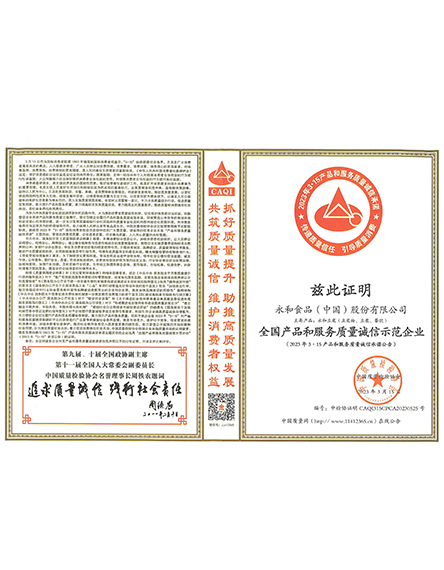 20243 月永和食品(中國)股份有限公司榮獲全國產(chǎn)品和服務(wù)質(zhì)量誠信示范企業(yè) -