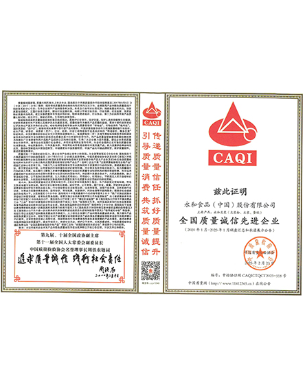 20232 月永和食品(中國)股份有限公司榮獲質(zhì)量誠信先進(jìn)企業(yè) -