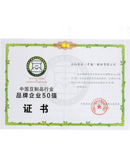 20235 月永和食品(中國)股份有限公司榮獲中國豆制品行業(yè)品牌企業(yè)50強(qiáng) -